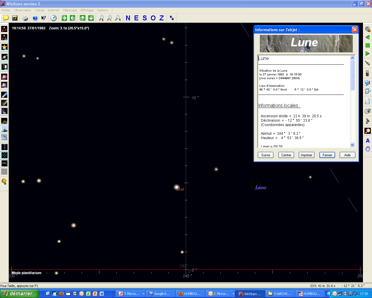 Une vérification astronomique nous indique (pour Nancy, à 19h15) que la Lune est à l'azimut 244, à 4,5° d'élévation (voir carte céleste), et apparaît sous forme d'un fin croissant incliné.