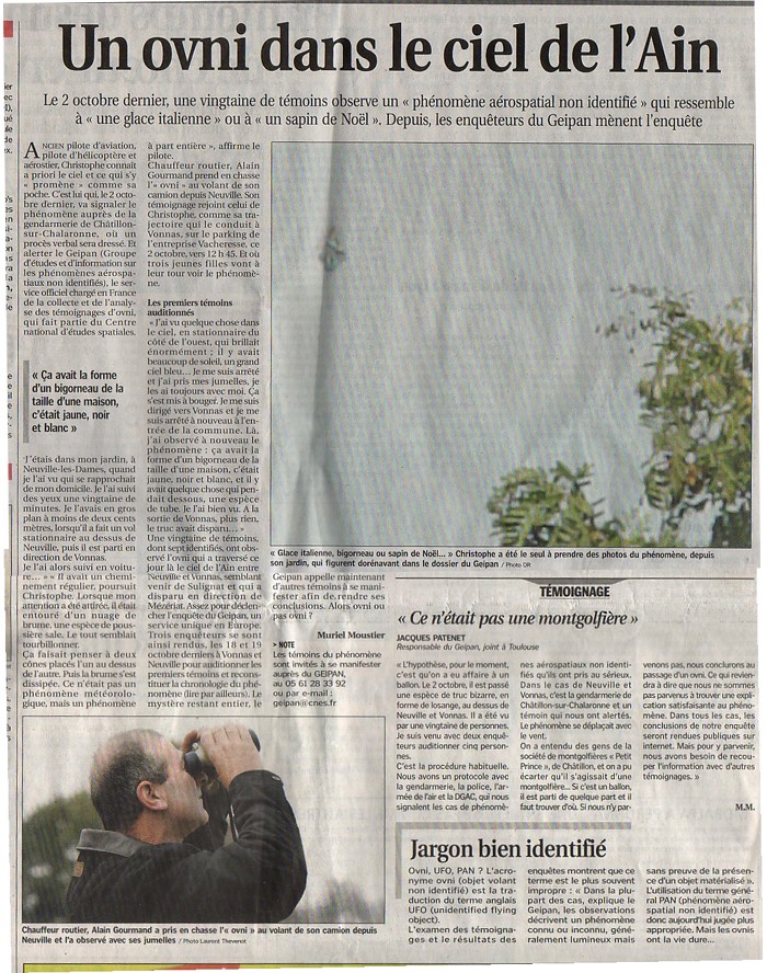 Le 02 octobre 2007 vers 13h, un témoin dans son jardin constate dans le ciel un phénomène particulier : une grande forme en losange de plusieurs couleurs vole silencieusement à faible altitude. Intrigué, ce témoin décide de suivre le phénomène en voiture durant 5 à 6 km entre Neuville-les-Dames et Vonnas. Il prend des photographies durant «la poursuite » et rencontre 4 autres témoins sur le parking d'une entreprise horticole de Vonnas également intrigués. Le témoin reprend ensuite la route en direction de Mézeriat, mais perd de vue le phénomène. Suite à un appel à témoins passé dans le quotidien Le Progrès, de nombreuses personnes se manifesteront.
