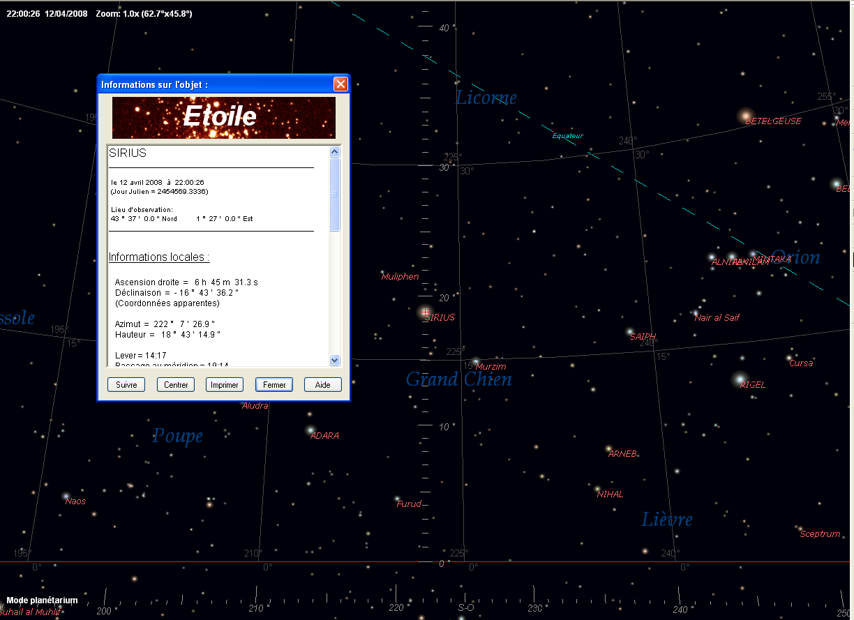 La carte du ciel du jour (voir ci-joint) indique que l'étoile Sirius, la plus brillante du ciel (magnitude -1,44) était dans le ciel au Sud Ouest à ce moment-là, à 18° au-dessus de l'horizon : lorsque cette étoile est visible bas sur l'horizon, elle surprend souvent les témoins, en particulier les jours où le ciel est bien clair. Elle aura disparu cachée derrière la colline.