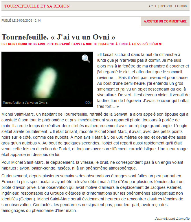 Suite à un article de presse, le GEIPAN décide d'enquêter sur une observation faite le 23 juin 2008 à 4h52 par un témoin qui a pris des photographies d'un phénomène lumineux dans le ciel.