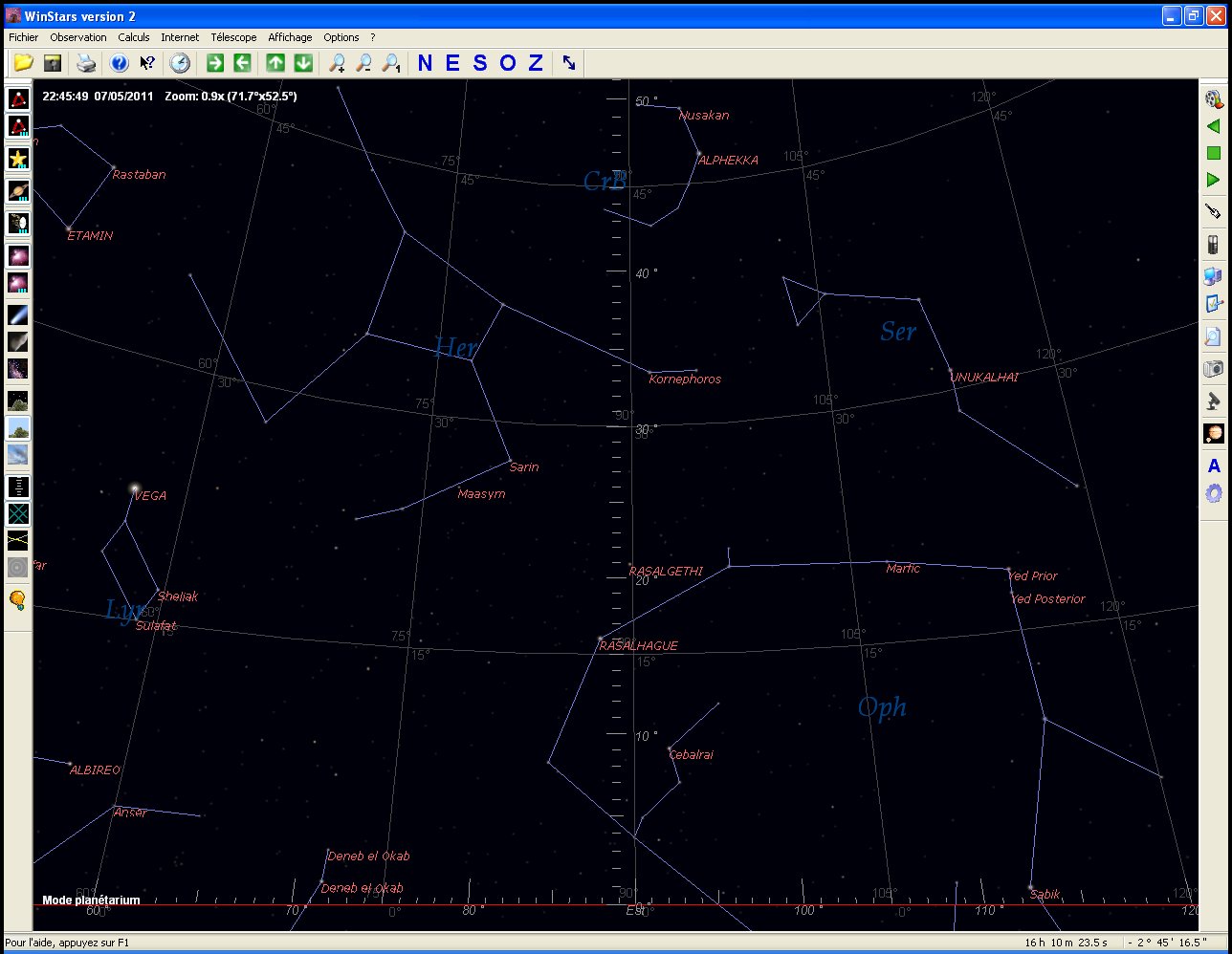 Un témoin rapporte son observation faite aux jumelles le 29 mai 2011 entre 22h410 et 22h45. Il observe le faible déplacement aléatoire Est-Sud d'une centaine de points lumineux blancs.