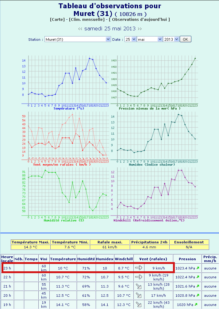 Le samedi 25 mai 2013 à 23h05, un témoin observe dans le ciel le lent déplacement d'une lumière clignotante de couleur avec un halo rouge. Aucun bruit particulier n'est entendu durant l'observation qui dure 2 minutes. La lumière s'élève dans le ciel pour disparaitre dans un nuage.