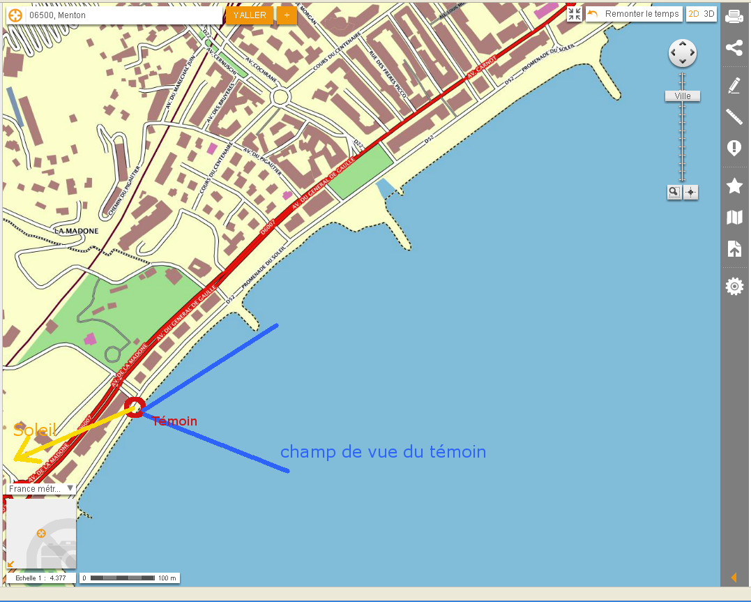 Le témoin observe depuis la plage de Menton (cf carte) un objet blanc allongé, entouré d'une auréole bien ronde, qui survole la mer à une distance qu'il ne peut estimer.