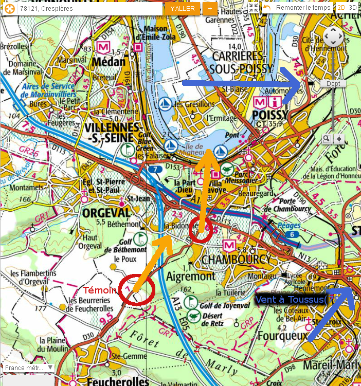 Le relevé Météociel indique un vent de Sud ouest à Toussus le Noble (au Sud Est de Poissy) et un vent d'ouest à Pontoise. On peut estimer un vent de SO à O à Poissy.