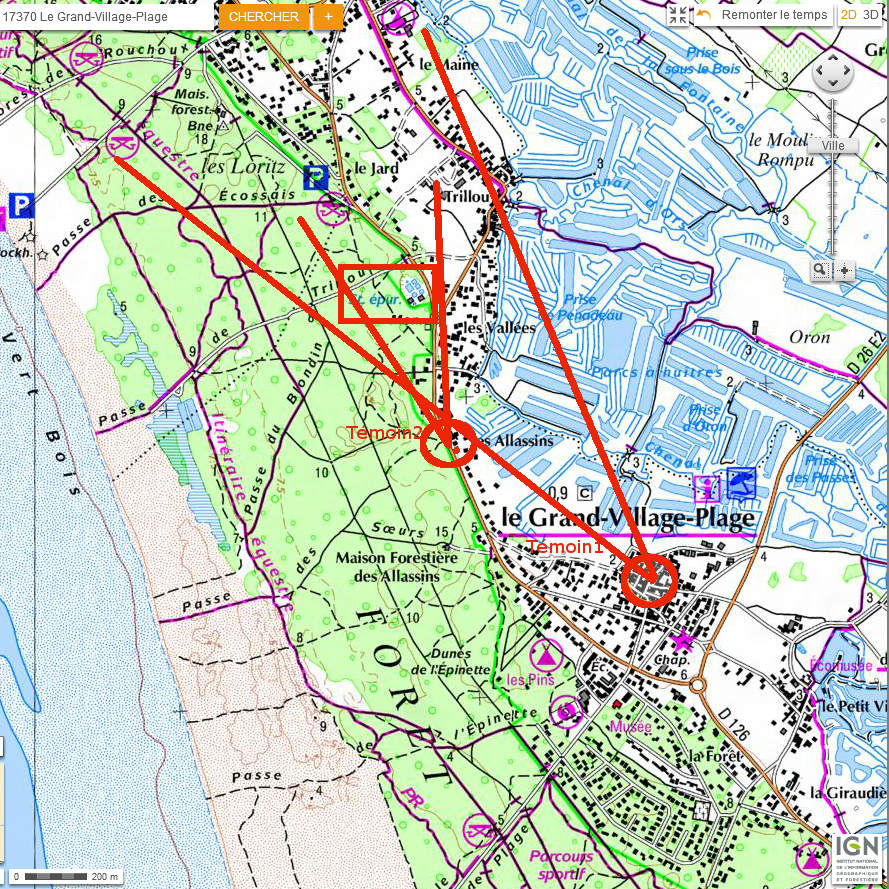 - les objets semblent stationnaires : le témoin, interrogé au téléphone, regardait vers le Nord-Ouest (voir carte), c'est-à-dire dos au léger vent de Sud-Est (voir le relevé météo à l'Ile d'Oléron et a vu un objet porté par le vent s'éloigne doucement du témoin, et semble immobile.