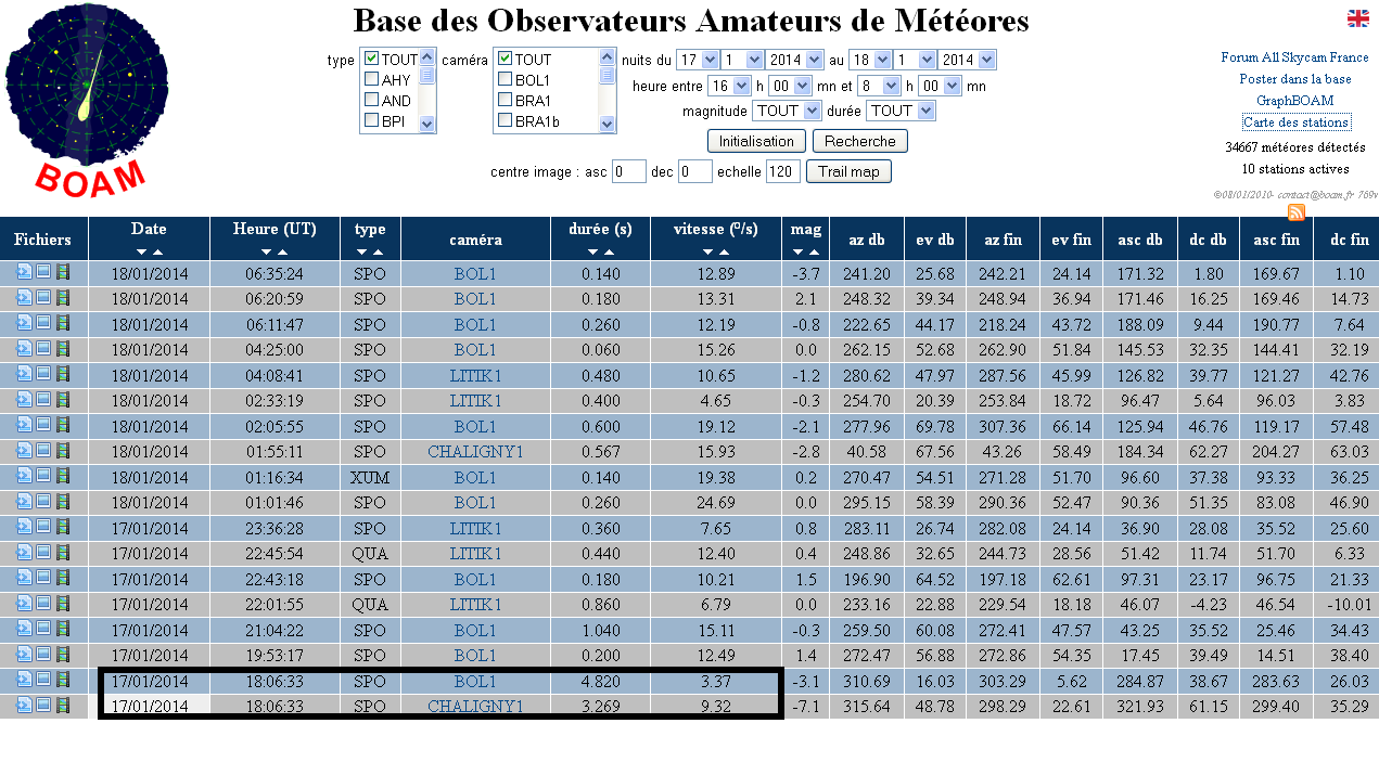Vg(vitesse) : 14 km/s, durée : 6.1 s, magnitude maximale (depuis Chaligny) : -7, magnitude absolue : -5.5, début > hauteur : 87 km , latitude : 49.08°N , longitude : 5.49°E ; fin > hauteur : 38 km , latitude : 49.20°N , longitude : 4.09°E, inclinaison : 25°, distance parcourue : 115 km".