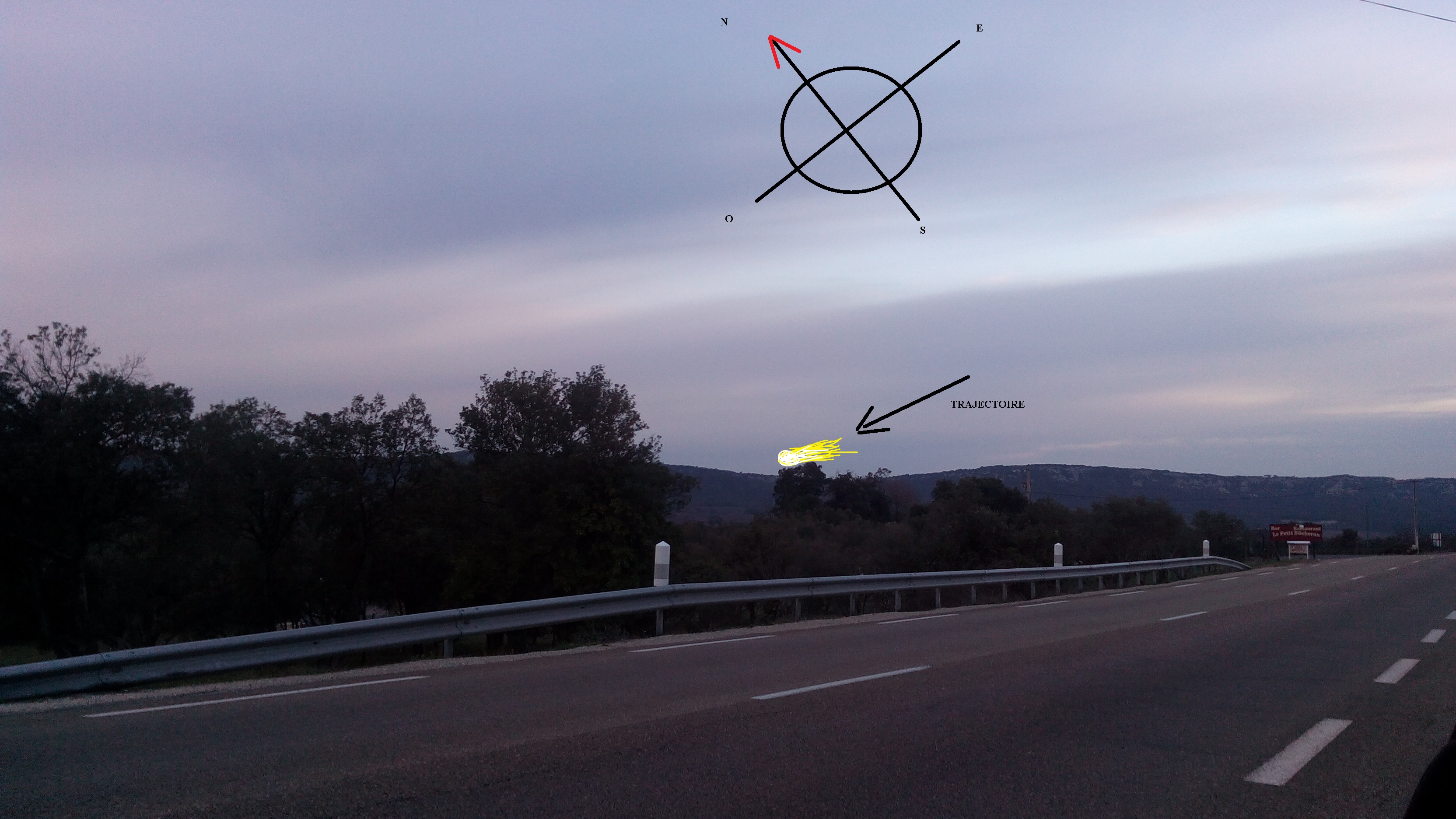 Le bolide est apparu au témoin direction N - NE, à une élévation (au-dessus de l'horizon) calculée de l'ordre de 5° à 2 ° (en tenant compte de la rotondité de la Terre), ce qui correspond bien au schéma produit par le témoin.