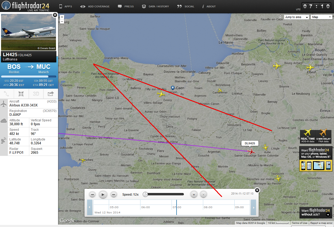 Le site Flightradar24 (voir ci-joint) indique à cette heure là plusieurs gros avions de ligne volant à haute altitude, venant de l'Ouest en direction de l'Est : un airbus A330 id DLH425, et un Boeing 777 les trainées de ces avions sont visibles jusqu'à 120km de l'observateur environ, où elles apparaissent avec un élévation sur l'horizon de l'ordre de 6°. A cette distance, le déplacement apparent est très faible, la traînée apparaît très courte par effet de perspective, et à contre jour du soleil levant apparaît jaune, orangée, voire rouge dans certains cas. Voir : des trainées d'avions étranges.