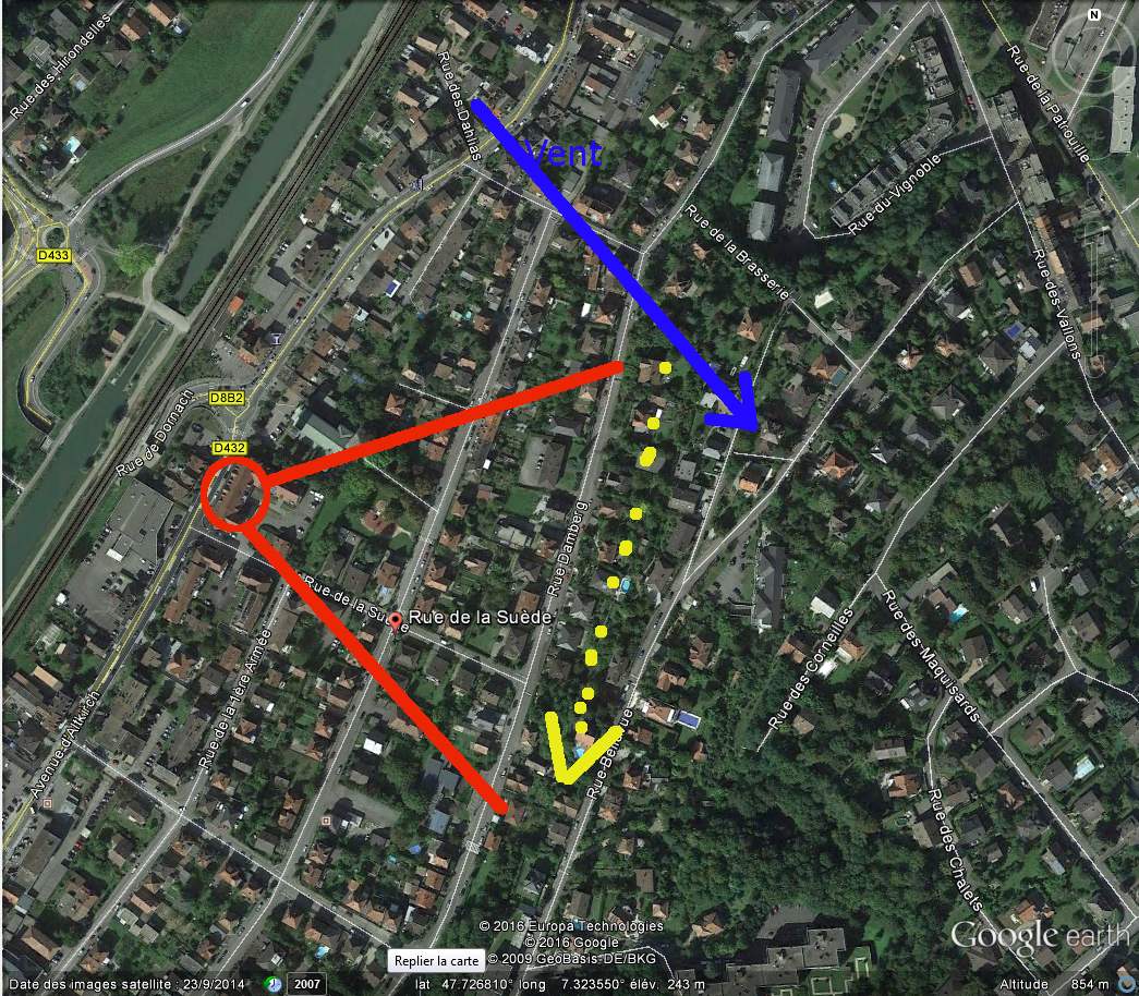 Le témoin indique dans son récit un déplacement vers l'Ouest, mais le dessin indique un déplacement du NNe vers SSO (voir la reconstitution cartographique). Le déplacement est observé globalement du Nord vers le Sud, ce qui est compatible avec le vent de Nord Ouest à Nord relevé à Mulhouse-Bâle (à 21h : léger vent de Nord de 7 à 11 km/h s'orientant à l'Ouest à 23h :Météociel.