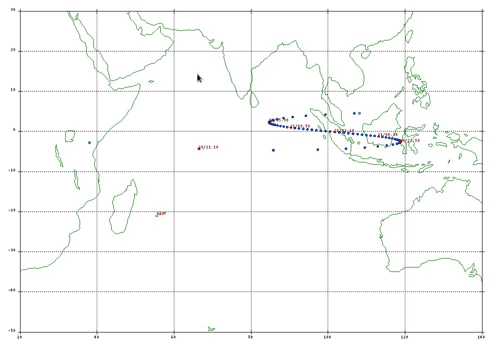 En effet, après investigation, la position de l'objet dans le ciel est cohérent avec la trajectoire de l'étage supérieur cryogénique du lanceur Ariane VA225, lancé de Kourou le 20/08 à 20h16 UTC ; cet étage, répertorié N40876, a commencé sa passivation (vidange du réservoir) à 21h12 ; il est passé à la verticale de l'Indonésie à plus de 8000 km d'altitude (voir carte ci jointe). Aux alentours de 21h30 UTC (date de prise de vue), l'objet était bien en visibilité de l'ile de la Réunion. Comme c'est un lancement de satellite géostationnaire sur une orbite de transfert très elliptique (environ 300km-36000 km), le lanceur est à ce moment-là déjà à très haute altitude, donc visible depuis une très large zone.