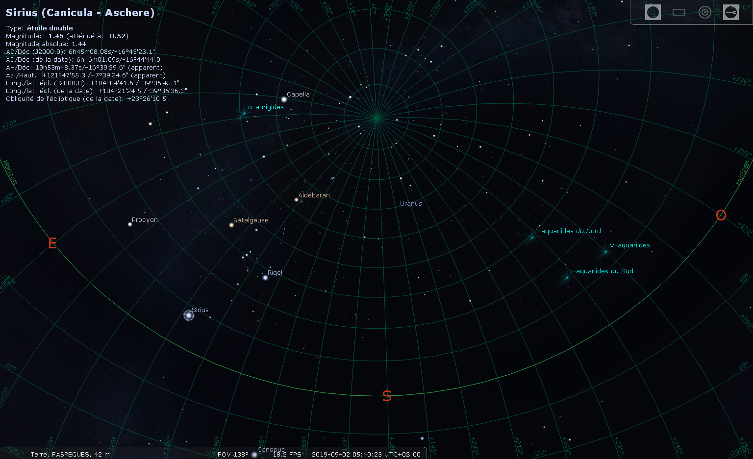 Les conditions astronomiques sur Stellarium confirment que le 02/09/2019 et les jours suivants, SIRIUS est normalement visible au SUD-EST du lieu d’observation avec cependant une élévation très basse montante vers 10° entre 5h et 6h (voir carte Stellarium jointe).