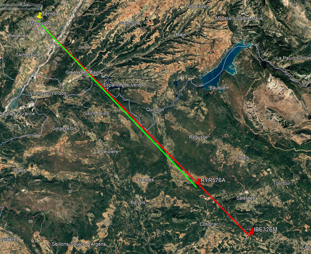 - RYR576A, évoluant à une altitude de 40 000 pieds (12 192 m), situé à une distance horizontale de 39 735 m du témoin (projection au sol mesurée sur carte) (voir Annexe 3).