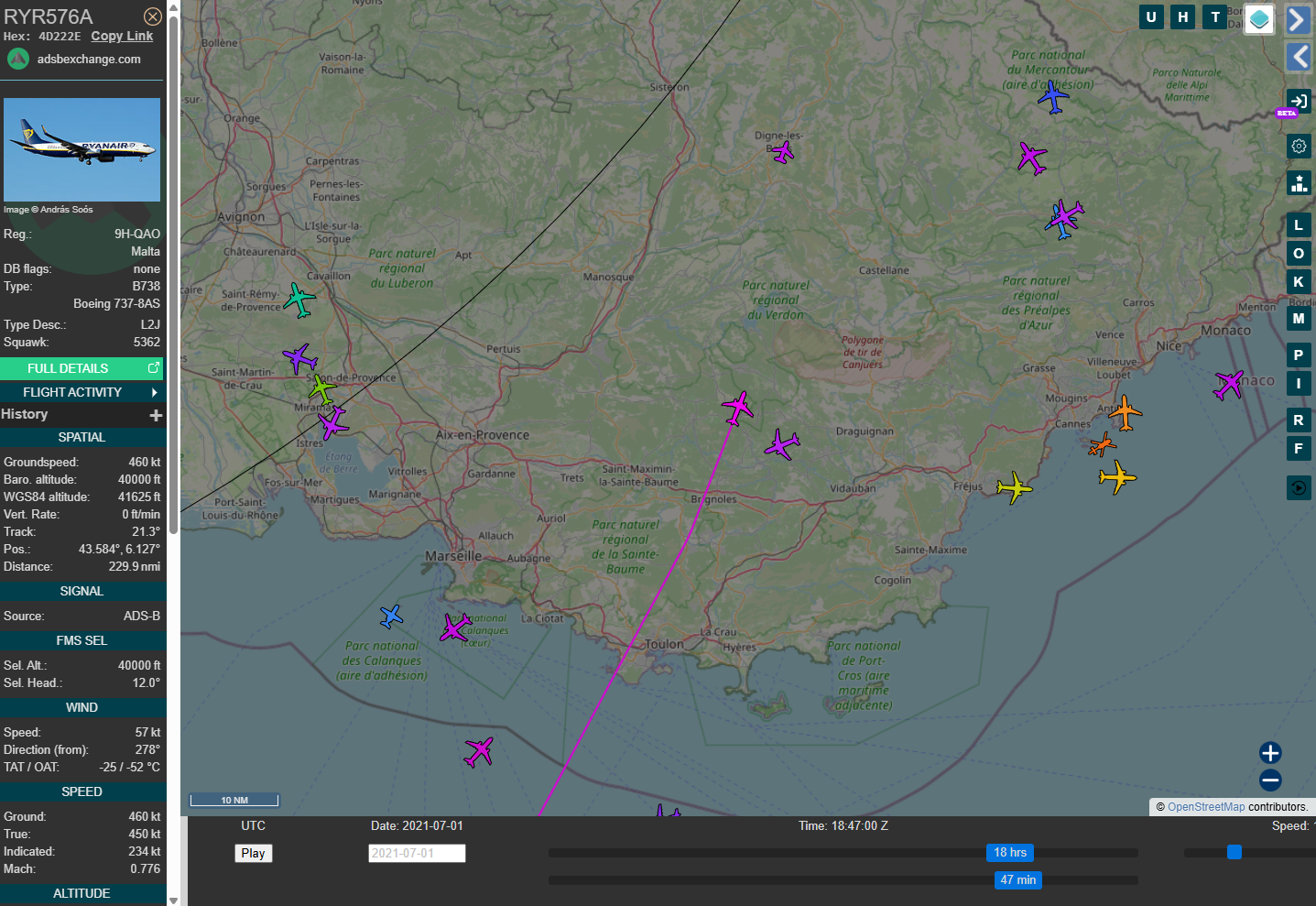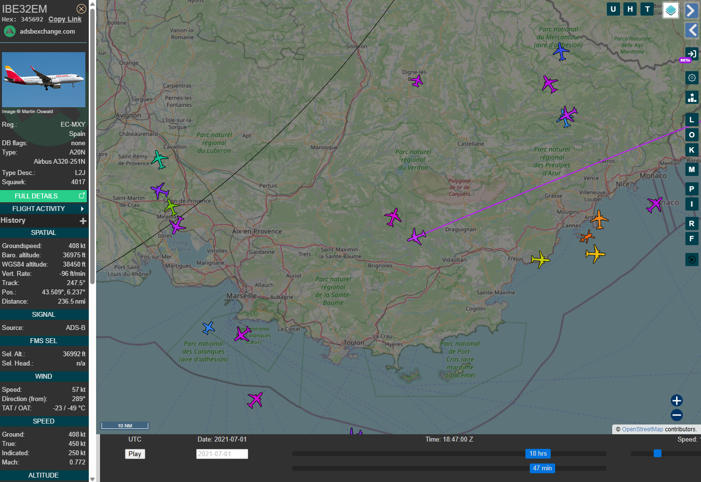 En complément, l'analyse menée à l'aide du site Globe.adsbexchange a permis de confirmer la présence simultanée de deux aéronefs se croisant à 18h47 UTC, dans l'axe d'observation du témoin (orientation sud-sud-est). Depuis sa position, ces deux objets pouvaient apparaître alignés sur une même trajectoire apparente. Il s'agit des vols :