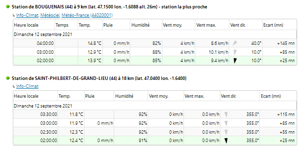 - la trajectoire cohérente avec la direction et le sens du vent (voir le document météo) rapportés par les stations de Bouguenais, à 9km du témoin et de Saint-Philibert-de-Grand-Lieu, à 18 km du témoin (10° et 355°).