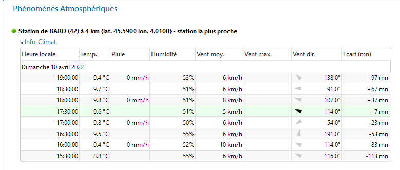 - le déplacement s’effectue de manière lente, régulière et rectiligne, avec des rotations du PAN sur lui-même. Le déplacement est globalement dans le sens du vent dominant (114°), le vent est très faible (voir le document météo): 5km/h et peut être variable localement ce qui génère de faibles turbulences et occasionne par conséquent une rotation du ballon sur lui-même.