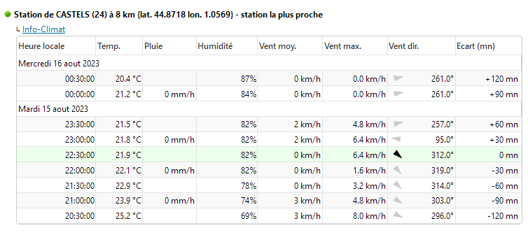 Le déplacement s’est lentement effectuée du SO vers le S. Ce qui est tout-à-fait cohérent avec les données météorologiques d’une station météo située à 8 km du lieu d’observation (voir le document météo) : vent orienté vers le SE et très faible (0km/h en moyenne et rafales à 6,4km/h).