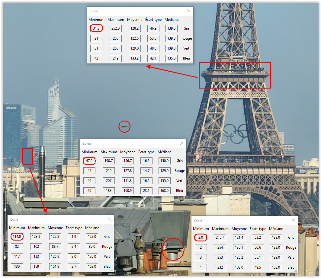 Avec cette méthode, il ne faut pas s'attendre à avoir des résultats précis, il ne s'agit que d'avoir une idée de la distance à laquelle se trouve le PAN. Ainsi, les valeurs radiométriques du PAN et de la Tour Eiffel étant proches d'une part, et du fait de la "dilution" vers le gris du noir qui le compose d'autre part, on peut considérer que le PAN se trouve dans une large zone possible entre l'objectif et la Tour Eiffel, et très vraisemblablement plus proche de l'objectif que de la Tour Eiffel. Il est certain en tous cas que le PAN ne se trouve pas au niveau des tours de la Défense en arrière-plan ni au niveau des estimations du témoin (entre 2 et 8 km).