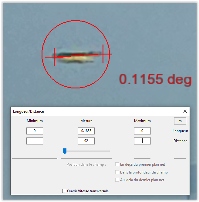 Sur Google Earth, la distance séparant le témoin du repère du toit est de 92 m. La longueur angulaire du PAN mesurée est de 0,12° environ, à cette distance ceci donne une longueur de PAN de 18,5cm environ (cf.annexe 2). Or cette valeur inclut une aberration de déformation longitudinale qui est accentuée par le zoom x10 (appelé "bougé").