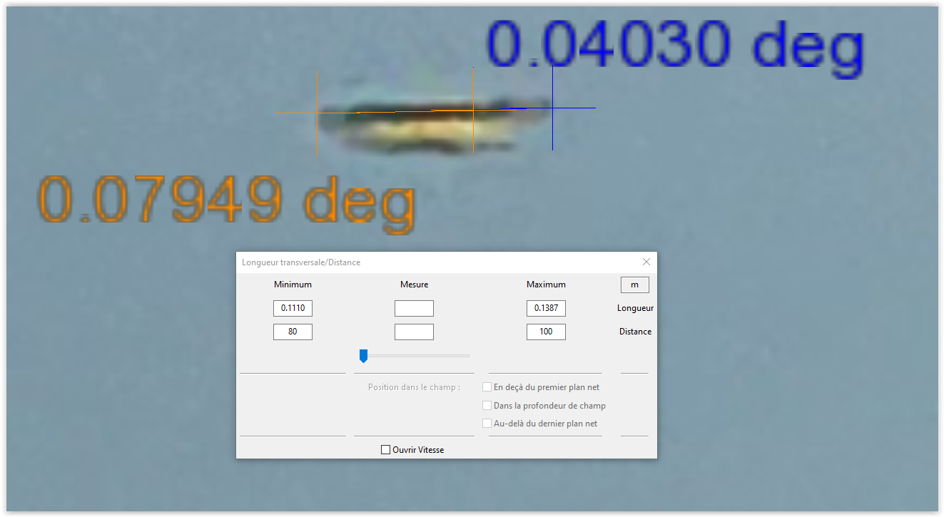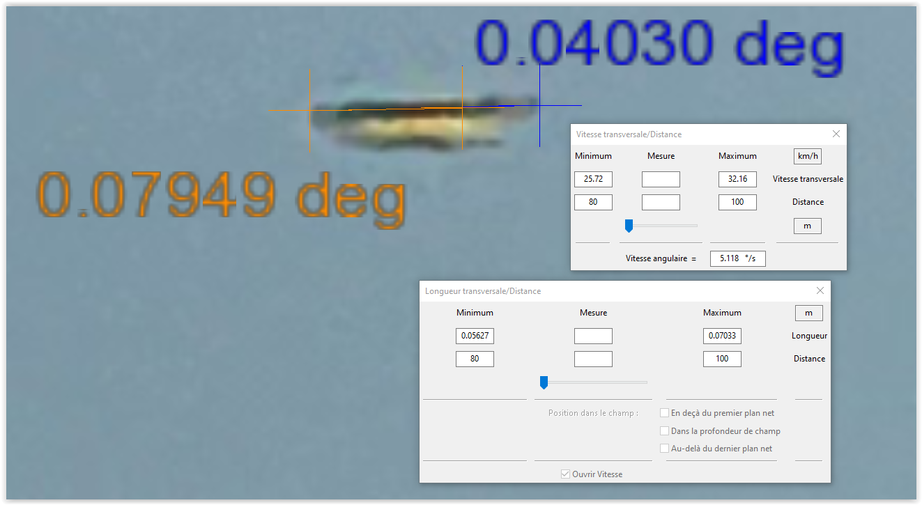 Toujours avec l'outil IPACO, pour la taille d'un oiseau de type mésange charbonnière (11 à 14 cm), en prenant une longueur angulaire de 0,08°, on obtient une distance de 80 à 100 m (cf.annexe 3), ce qui est tout à fait conforme aux résultats de l'étude radiométrique. L'outil IPACO permet également d'évaluer des vitesses de déplacement en se basant sur la longueur angulaire du "bougé" et la distance. En partant de la valeur de 0,04° de "bougé" ,», pour des distances entre 80 et 100 m, on obtient une vitesse de 25 à 32 km/h (cf.annexe 4) ce qui là aussi est tout à fait cohérent avec la vitesse de déplacement d'un d'oiseau de type mésange charbonnière.