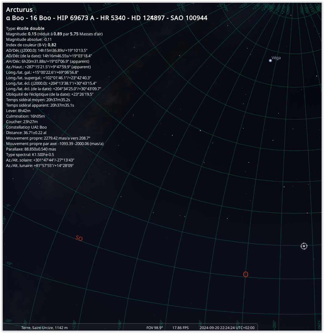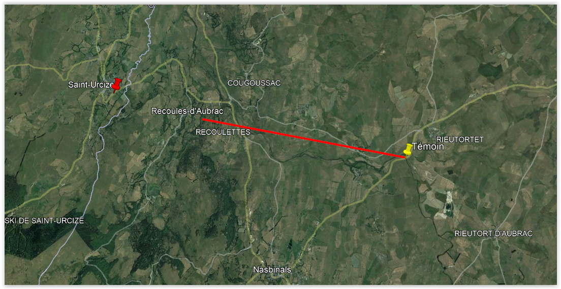 - Une reconstitution géographique effectuée à l'aide des éléments fournis par T1 (et en particulier une photographie diurne indiquant l'emplacement du PAN dans le ciel) a permis de localiser le PAN en azimut et en élévation à un emplacement assez proche de celui d'Arcturus au moment de l'observation. En utilisant le logiciel Stellarium, la position d’Arcturus a été déterminée avec précision : environ 287° d’azimut et 9° d’élévation (voir AC_astro_1). Quant au PAN, il a été estimé par T1 à un azimut d’environ 280° (voir AC_geo_1) et à une élévation située entre 30° et 45. Le décalage en azimut (inférieur 10°) peut être imputé à la difficulté pour T1 de s'orienter de nuit sans aucun repère (nuit totalement noire) a fortiori dans un lieu qu'il ne connaît pas. La différence en élévation (environ 20/35°) peut s'expliquer par une surestimation que l'on rencontre souvent de la part des témoins de PAN. Les indications "au-dessus de la colline " et "un peu plus que l'horizon" fournies par ailleurs par T1 confirment bien une élévation plutôt basse.