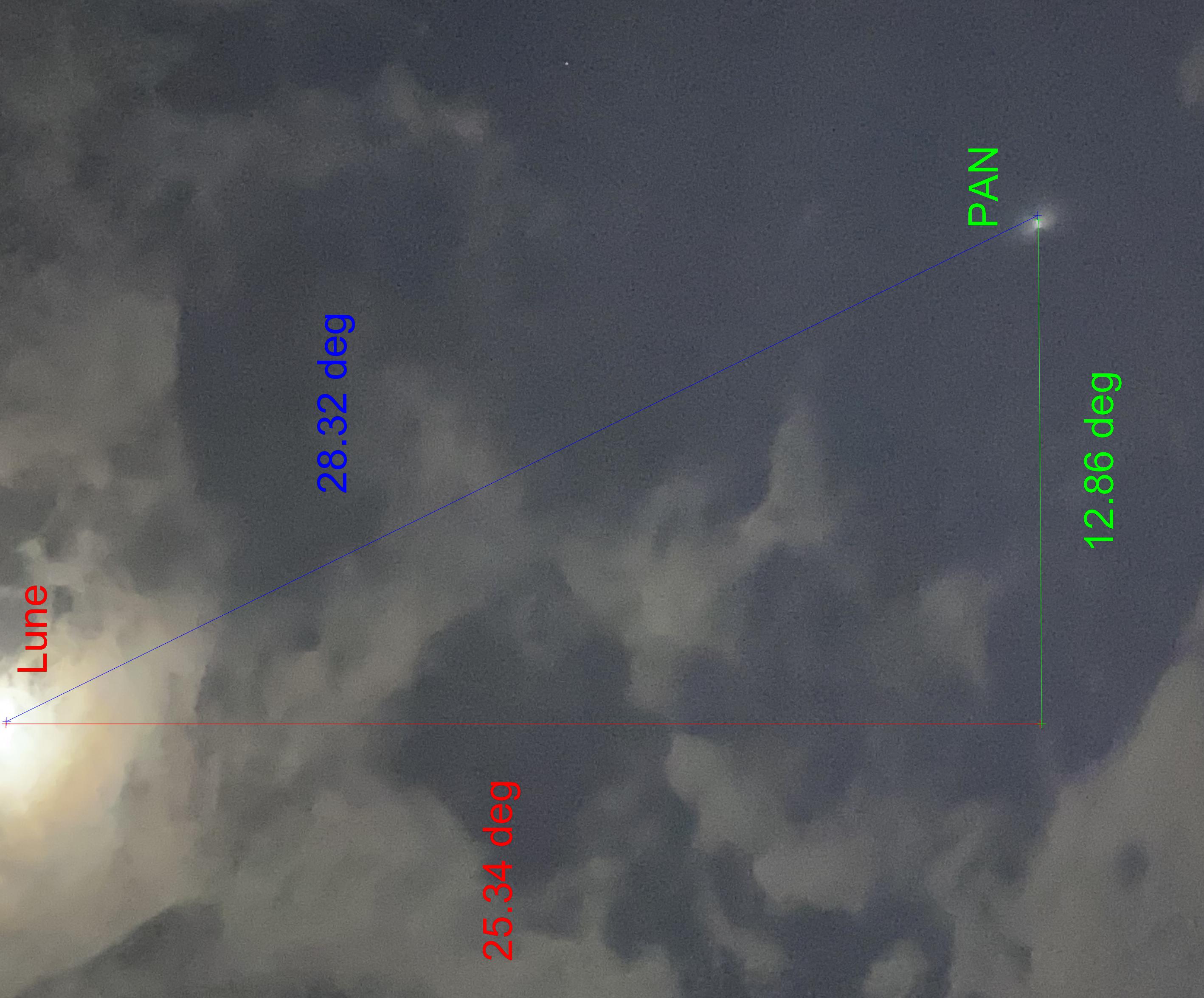 - La position a pu être confirmée par l'exploitation d'une photographie transmise par le témoin, à l'aide du logiciel d'analyse photo du GEIPAN, IPACO* (annexe 2) comparée aux données disponibles sur la modélisation de sa trajectoire via intersky.org (annexe 3). L'heure indiquée sur la carte du ciel d'inthesky pour la position est de 18h58, soit environ deux minutes plus tôt que l'heure de la photographie, une différence que l'on explique lorsqu'on compare une trajectoire modélisée avec la réalité sur un objet en phase de rentée atmosphérique.